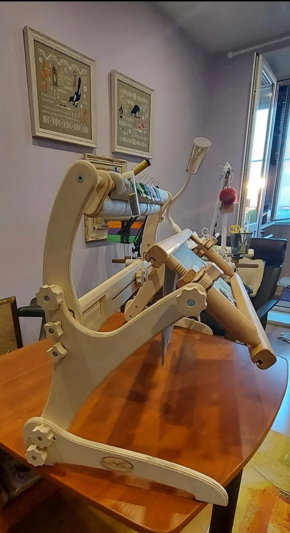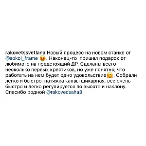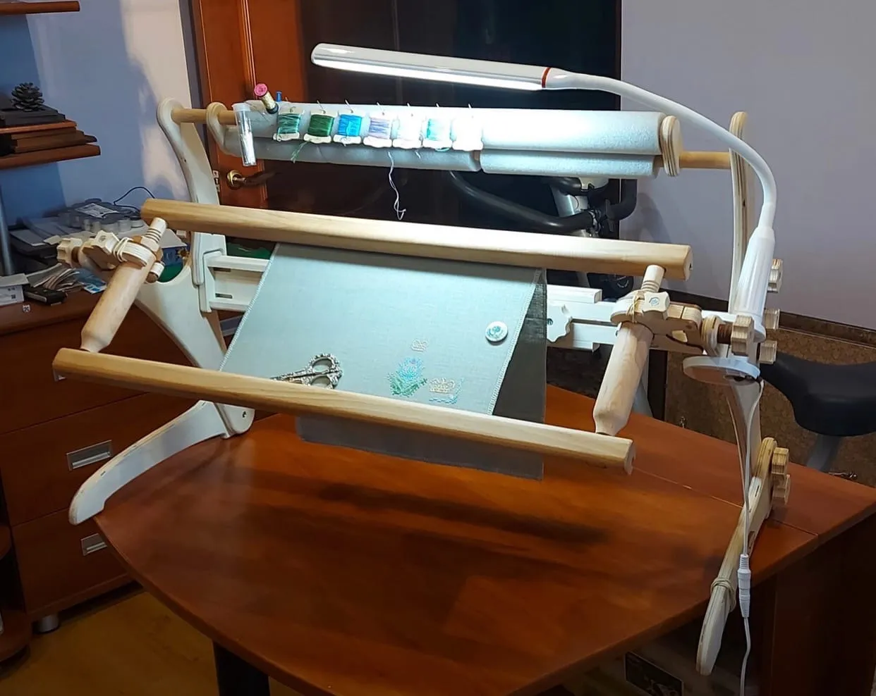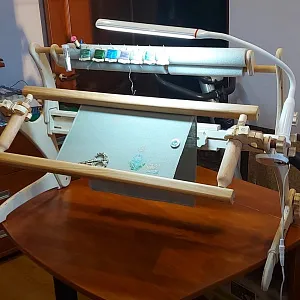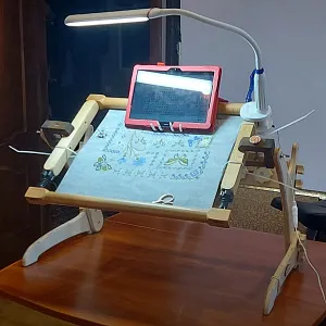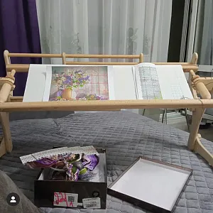 Станок красив, легок, но притом устойчив, чувствуется его серьёзность и основательность. Раньше у меня был опыт использования диванных станков- не пошло, тряслись и вибрировали страшно... до сих пор лежат в гараже... А этот специально качала и пыталась расшатать- куда там! Стоит, как приклеенный. Даже навешанная рама 70см, лампа и планшет существенно не повлияли на вес и устойчивость станка- переставляется он влево/вправо без проблем и заморочек. Сидеть "внутри" мегаудобно, даже с моими, далеко не девичьими, габаритами- ничего не мешает и всё под рукой.