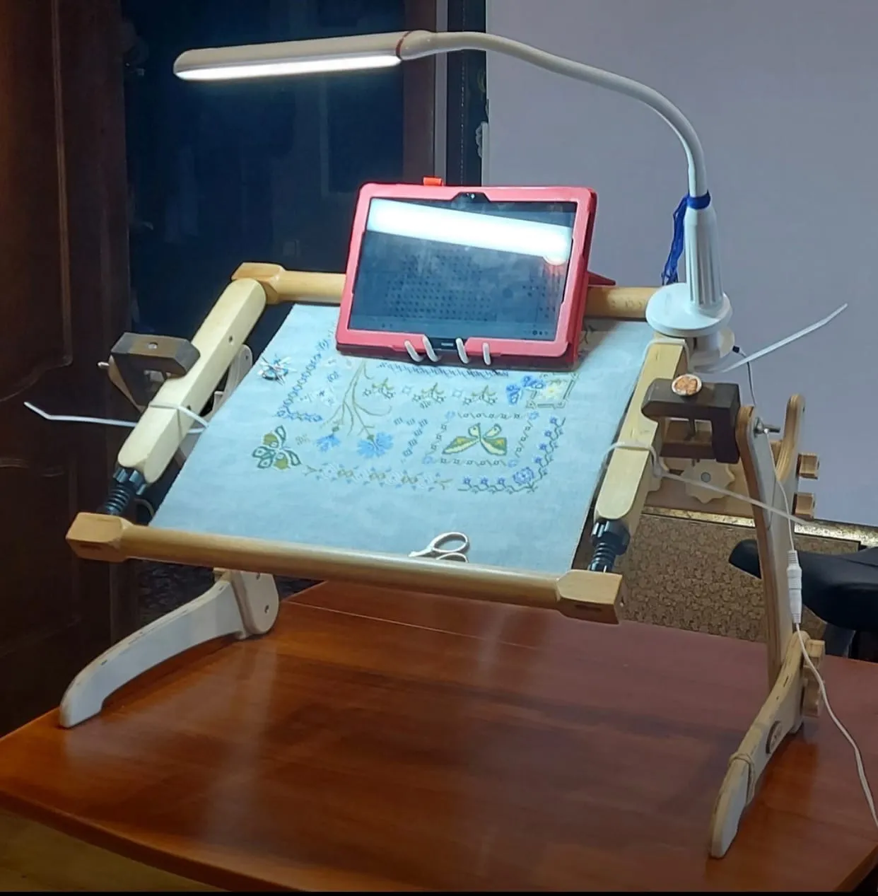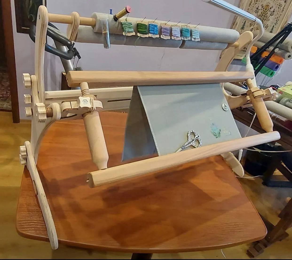 Можно использовать, кстати, и другие комплектующие, коих у опытных вышивальщиц в закромах много . На последнем фото рама Квантум от Оманик и держатели от Григория Куприна- сборная солянка- и в этом станок очень доброжелательным оказался. Всё подходит идеально. Но глазу приятнее всё же "родные" держатели и рама