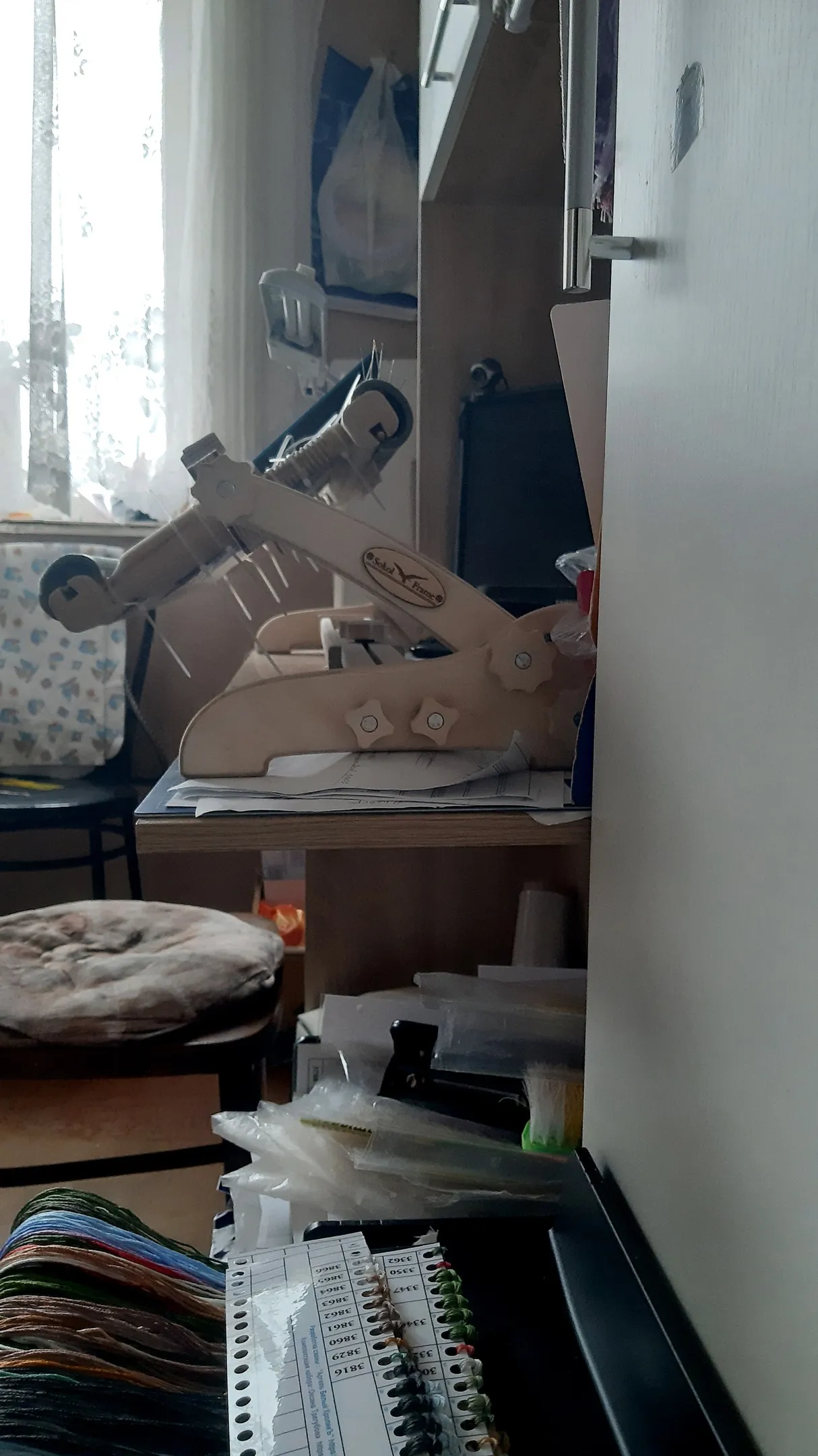 У меня нет возможности оставлять станок на столе постоянно, по этому я его убираю на верхнюю полку над столом. Представили да?: я на стульчик, беру станок за ножки и ставлю вниз на стол. Закончила вышивать -беру уже за держатели рамы и убираю обратно на верхнюю полку. Тоесть два раза в день я его тягаю туда сюда и ничего не разбалтывается!